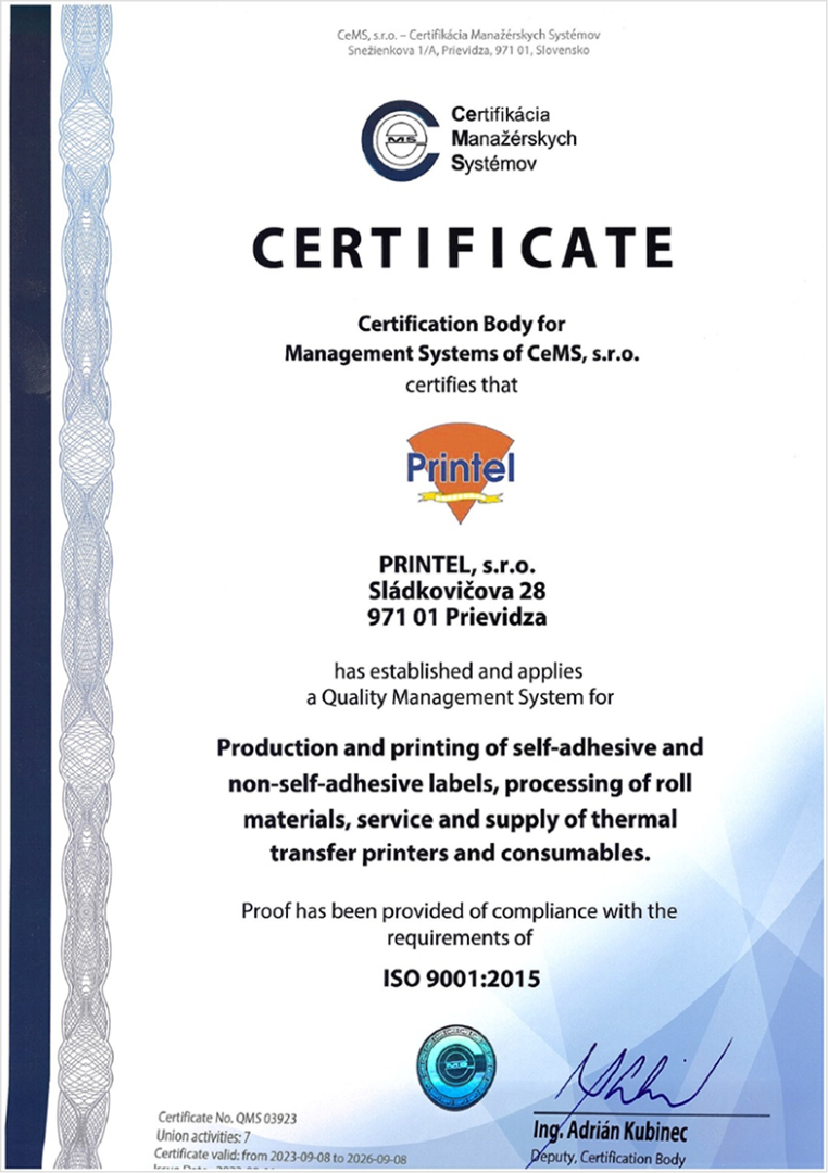 Naša spoločnosť PRINTEL, s.r.o. sa dlhodobo riadi prísnymi štandardmi kvality. Kvalita našich produktov a služieb je základom dôvery našich partnerov a úspechu na trhu.